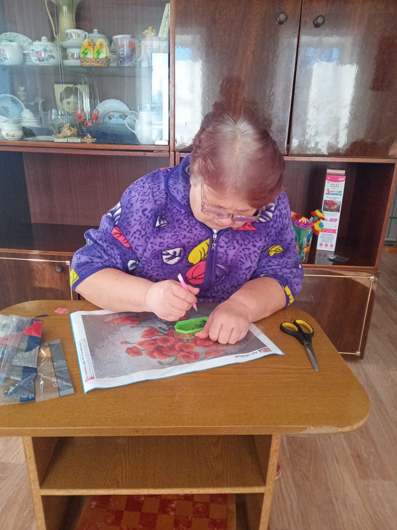 Алмазная мозаика – это вид творчества, не требующий особых умений и знаний, но приносящий неоценимую пользу для организма. Для пожилого человека поддерживать моторику рук – необходимость. Именно занятия рукоделием становятся залогом долгого здоровья суставов и даже ума. Тренировка концентрации внимания, сосредоточение на объекте необходимы также при восстановлении после перенесенного инсульта. А еще, стоит отметить, что алмазная живопись способствует снижению уровня стресса и прекрасно успокаивает. Вот и наши обслуживаемые увлекаются выкладыванием картин из алмазной мозаики, это их хобби. Готовые картины дарятся родным и знакомым.