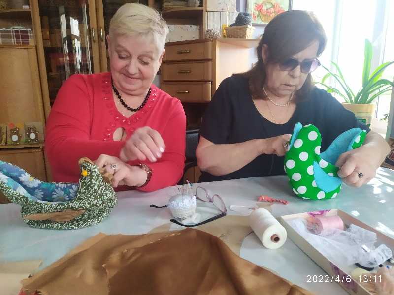 Наши пенсионеры шьют корзиночку-курочку для пасхальных яичек. Осталось немного доработать некоторые детали и корзиночки предстанут на выставке творческих работ смены.