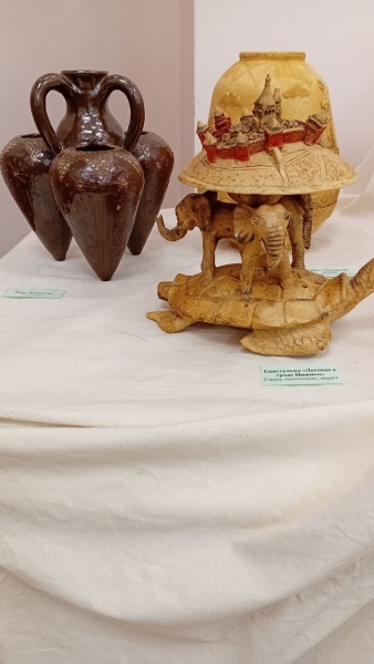 Посетители увидели керамические работы, выполненные в старинной технике обжига и молочения, например, фигуру «Покров» с изображением Дмитриевской башни и звуковым эффектом. Кружка с Симарглом — «собако-птицей» из славянской мифологии — также привлекла внимание.