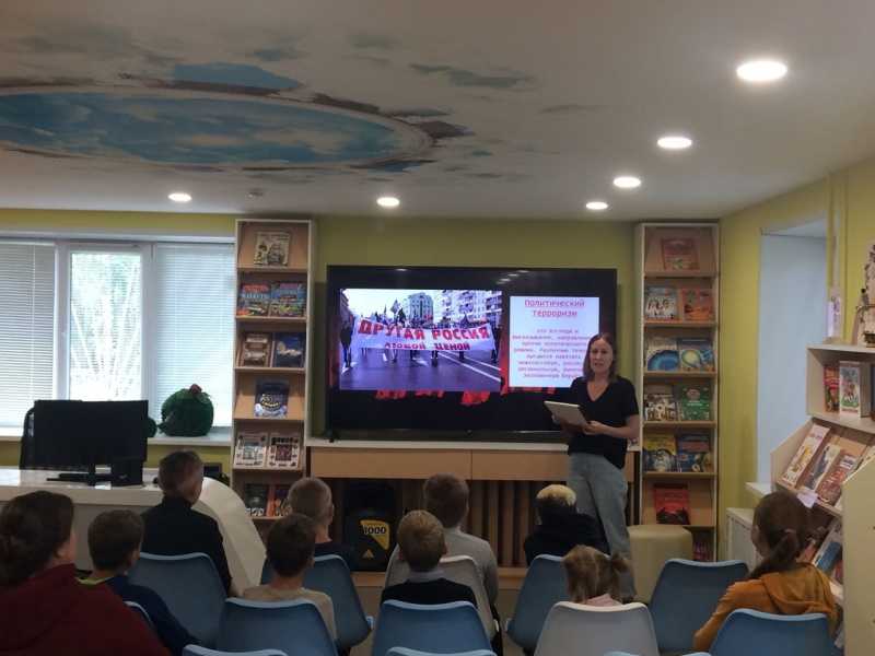 Ребятам напомнили о важных правилах поведения при угрозе терактов. Специалисты библиотеки показали детям видеоролик о трагедии в Беслане. По окончании мероприятия ребятам подарили закладки для учебников с надписями «Мы против терроризма». Также детям вручили сладкие угощения.